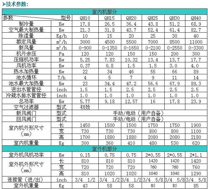 該系列產品為柜式三集一體除濕熱泵機組,帶池水熱泵輔助加熱水冷冷凝器和室外機??赏瑫r控制室內空氣溫濕度,具有除濕功能、空調制冷、制熱功能,池水輔助加熱功能和水恒溫功能。池水初始加熱由鍋爐或空氣源熱泵或電加熱實施。