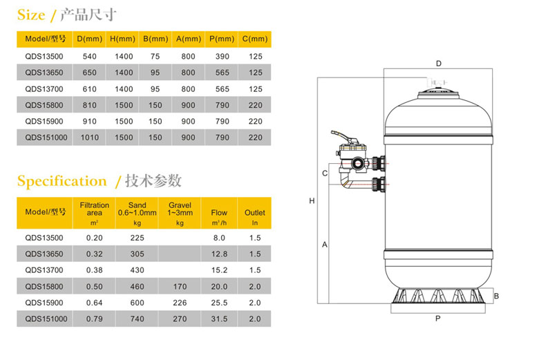 特性:缸身表面光滑,易清洗;抗紫外線;過濾砂床高;過濾效果好;可露天安裝
