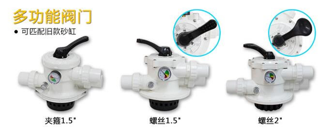 過濾砂缸的工作原理是:過濾砂缸是利用特殊的濾沙將池中的微小污物消除,濾沙作為清除污物的介質(zhì),被填裝在過濾砂缸的腔體內(nèi),當控制旋鈕打到“FITER"位置時,含有懸浮的污物微粒的池水由泵壓入過濾管路中,再由控制開關(guān)的引導到達顧慮器的出水口,池水經(jīng)過過濾器,微小的污物被沙床撲集濾除掉,過濾后的清水由過濾器底部經(jīng)控制開關(guān)再由管道返回的泳池。這一整套程序都是聯(lián)系自動的,且為泳池過濾器和管道系統(tǒng)提供了完整的循環(huán)過程。過濾器經(jīng)過一段時間的使用,積存的污物阻礙水流使其減弱。這是需要對過濾器進行清洗,蔣控制開關(guān)打到”反沖洗“位置,這時水流就變成了反方向流動,水流直接到達過濾器腔體的底部,再經(jīng)過沙層反沖上來,將以前撲集的污物、殘渣沖起從排污口排出,每次反沖洗后,應將控制開關(guān)打到”RINSE“位置,開啟水泵0.5-1分鐘后關(guān)閉,然后打到:FILER”位置,重新開始正常的過濾。過濾砂缸安放及接上出入水管后,即可把過濾沙放進缸內(nèi),過濾沙的直徑規(guī)格是0.6-0.8MM,先把砂缸注一半水,再用漏斗把沙注入,注意不要損壞砂缸底部的收集水管,亦不要讓沙進入砂缸的出水管。安裝過濾砂缸頭以下的程序必需嚴格遵守,以防砂缸起動或操作時爆炸,造成人命及財產(chǎn)損失。